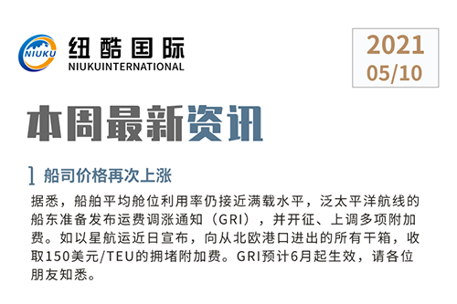 據(jù)悉,船舶平均艙位利用率仍接近滿載水平,泛太平洋航線的船東準(zhǔn)備發(fā)布運(yùn)費(fèi)調(diào)漲通知(GRI),并開(kāi)征、上調(diào)多項(xiàng)附加費(fèi)。如以星航運(yùn)近日宣布,向從北歐港口進(jìn)出的所有干箱,收取150美元/TEU的擁堵附加費(fèi)。GRI預(yù)計(jì)6月起生效,請(qǐng)各位朋友知悉。
